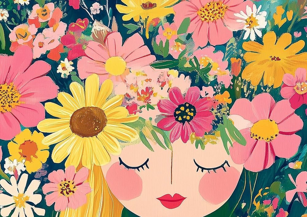 Der Hintergrund bildet ein malerisches Blumenfeld in gelben, rosa und weißen Farbtönen, als ob die Natur selbst hinter ihr atmen würde. Blumen schlängeln sich durch ihren blonden Seitenscheitel, als wäre sie nicht nur in der Natur, sondern ein Teil von ihr. Es ist, als würde sie selbst aufblühen, aber nicht mit einer lauten Geste - eher in der Stille, in der Hingabe, im Vertrauen.