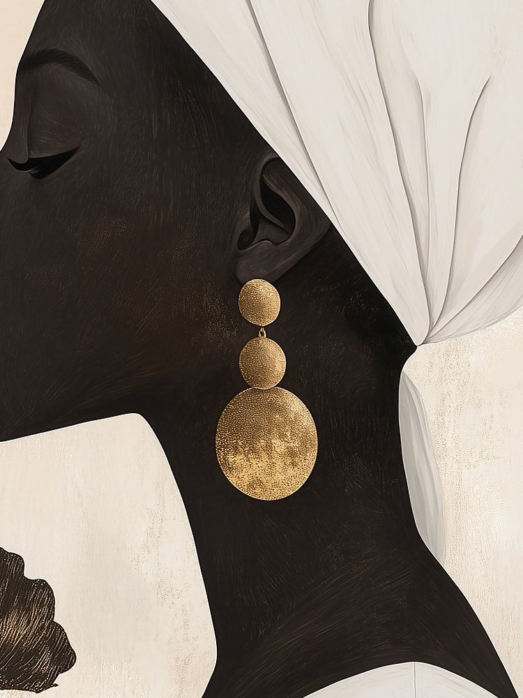 Die Verwendung von Farben - warme Erdtöne, sattes Schwarz und sanfte Goldakzente - unterstreicht die Sanftheit und gleichzeitig die Stärke des Bildes. Das weiße Tuch um ihren Kopf fügt eine spirituelle und kulturelle Dimension hinzu und symbolisiert Reinheit, Tradition oder vielleicht einen Neuanfang.