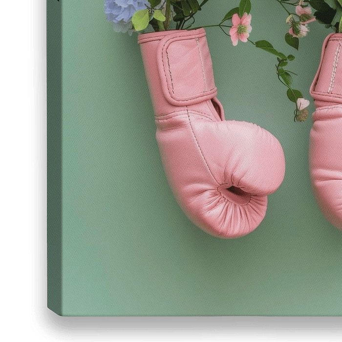Das Bild zeigt eine kreative Fusion aus Sport und Natur: Zarte, rosa Boxhandschuhe, gefüllt mit farbenfrohen Blumen. Die Kombination aus kräftigem Pink, leuchtenden Orange- und zarten Pastelltönen verleiht dem Bild eine charmante Verspieltheit. Der sanfte grüne Hintergrund rundet die Komposition harmonisch ab und schafft einen…