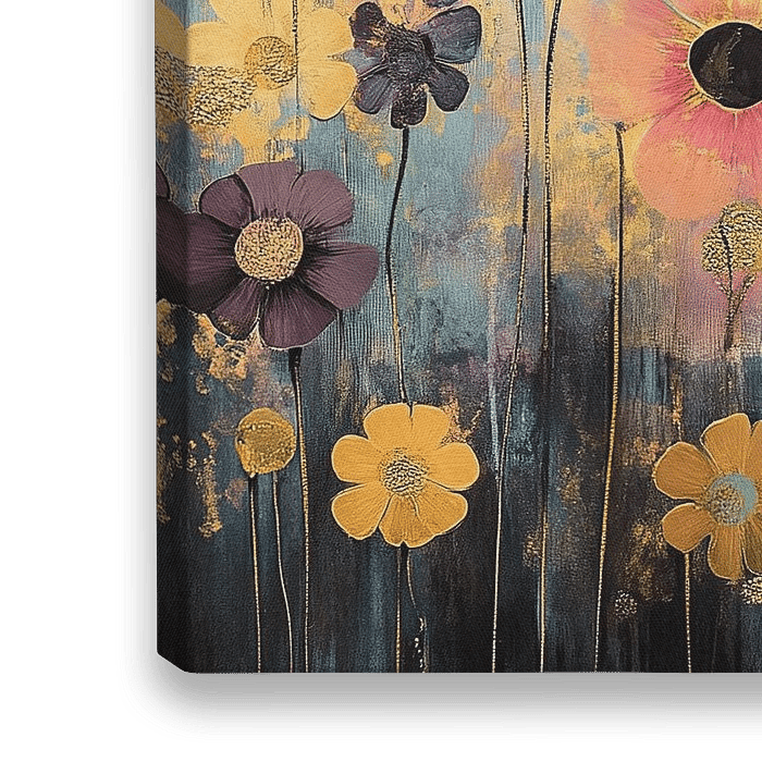 Blooms in Golden Hues - Dieses florale Gemälde zeigt eine lebendige Sammlung stilisierter Blumen in verschiedenen Farben vor einem goldenen und blauen Hintergrund, angereichert mit subtilen goldenen Akzenten, die ein luxuriöses Gefühl vermitteln.