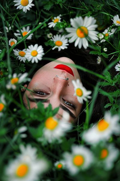 Inmitten einer bunten Blumenpracht wirkt das Bild wie ein Traum aus der Natur. Die junge Frau liegt mit ihrem Kopf in Wiese voller Gänseblümchen, ihre leuchtend roten Lippen und der Piercing heben sich kontrastreich von der grünen Umgebung ab. Ihre Augen spiegeln eine tiefe Ruhe und Verbundenheit mit der Natur wider, während sanfte…