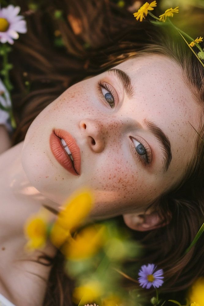 Inmitten einer bunten Blumenwiese liegt eine junge Frau entspannt im Gras. Ihr verträumter Blick und die sanften, natürlich gewellten Haare harmonieren wunderbar mit der lebhaften Flora. Die spritzige Frische der Blüten in Gelb, Pink und Lila umrahmt ihr Gesicht und betont die zarten Sommersprossen auf ihrer Haut, die dem Bild eine unbeschwerte Leichtigkeit verleihen.