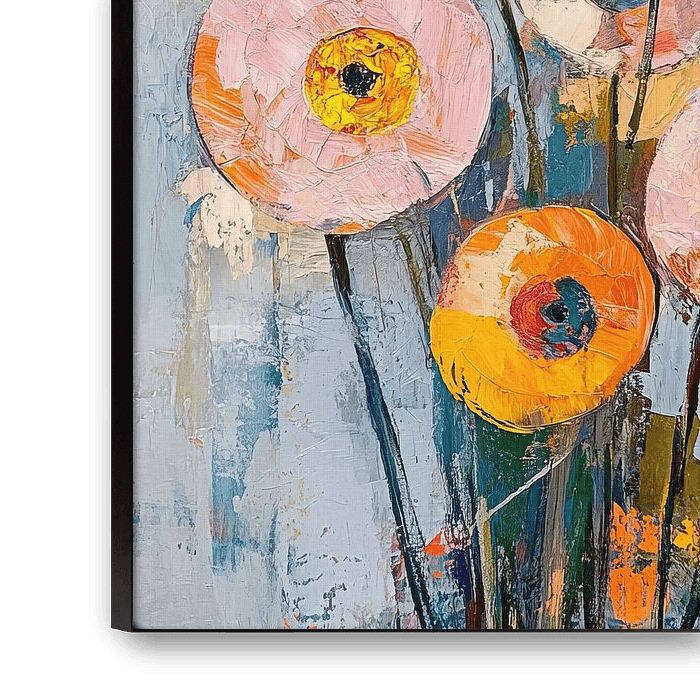 Flowers | Modern Flowers in Style - Dieses Blumenbild zeigt eine Sammlung lebendiger, stilisierter Blumen in verschiedenen Farben vor einem strukturierten, neutralfarbenen Hintergrund, wobei dicke Pinselstriche einen dynamischen und modernen Effekt erzeugen.