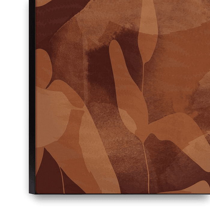 Bestelle dieses abstrakte Wandbild Blumen und Blätter in Terrakotta auf Braun. Abstrakte botanische Kunst. von Dina Dankers als Reproduktion auf Leinwand, Alu-Dibond, als Poster, Fototapete oder Acrylglasbild.