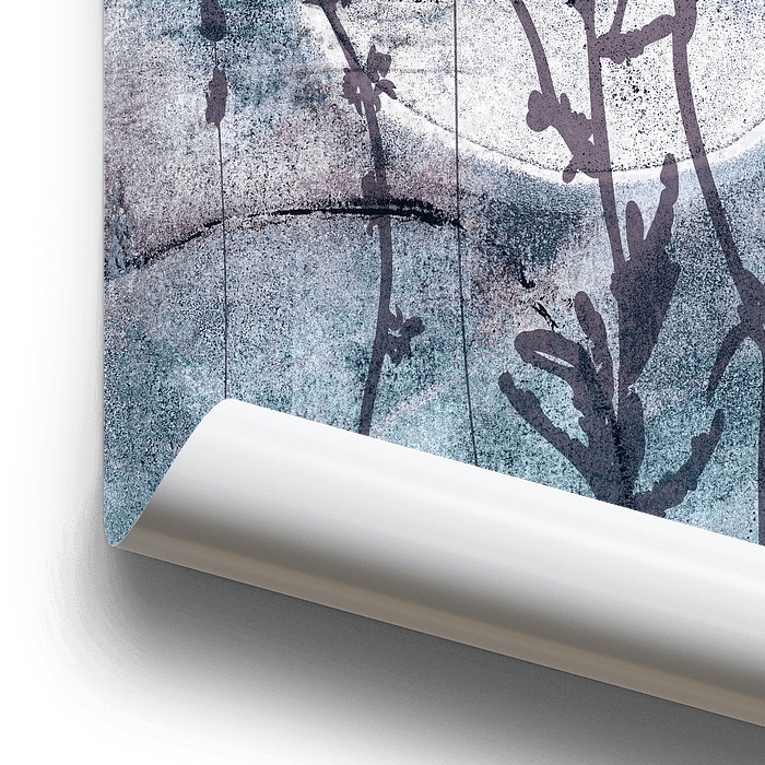 Bestelle dieses Blumen-Wandbild Blumen und Gräser auf abstrakte Malerei in blau und weiß von Dina Dankers als Reproduktion auf Leinwand, Alu-Dibond, als Poster, Fototapete oder Acrylglasbild.