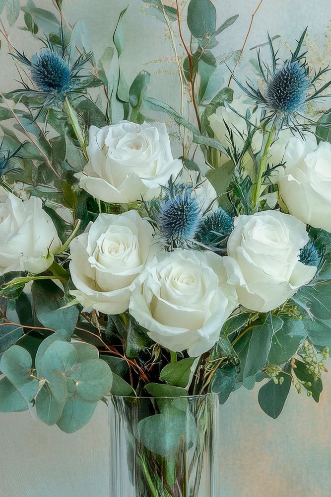 Ein zarter Strauß weißer Rosen, umgeben von sanften Eukalyptusblättern und blauen Disteln, entfaltet eine harmonische Eleganz. Die filigranen Details und die subtile Farbpalette verleihen jedem Raum eine beruhigende Atmosphäre. Ideal für das Wohnzimmer, bringt dieses Arrangement einen Hauch von natürlicher Schönheit und Frische in Ihr Zuhause.