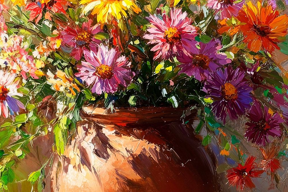 Ein buntes Schauspiel der Natur entfaltet sich in dieser üppigen Blumenpracht. Gelbe Sonnenblumen strahlen neben zarten, violetten Blüten um die Wette, während das rustikale Tongefäß einen Hauch von Erdverbundenheit ausstrahlt. Der Szenen setzte ein warmes Licht in Szene, das die Farben lebendig erblühen lässt und die Frische des Lebens einfängt.