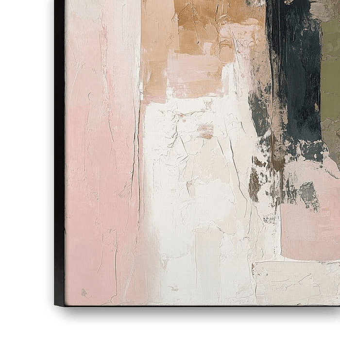 Ein Kunstwerk, das von sanften Pastelltönen, insbesondere Rosa und Creme, dominiert wird und durch erdige Akzente in Olivgrün und Beige ergänzt wird. Die Komposition besticht durch ein spielerisches Gleichgewicht zwischen geometrischen Flächen und organischen Texturen; die sichtbaren Pinselstriche erzeugen eine fühlbare Tiefe. Das Werk strahlt eine ruhige, moderne Eleganz aus, die sich perfekt in zeitgenössische Einrichtungsstile einfügt.