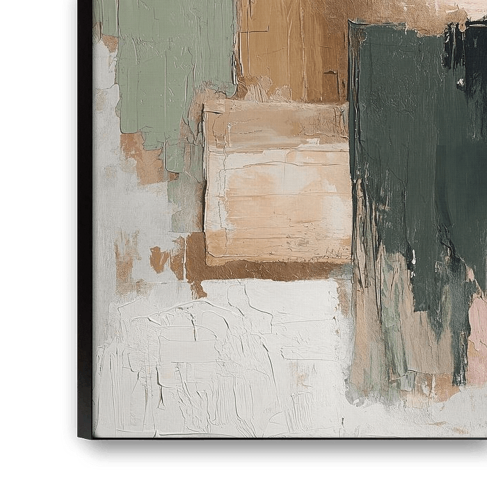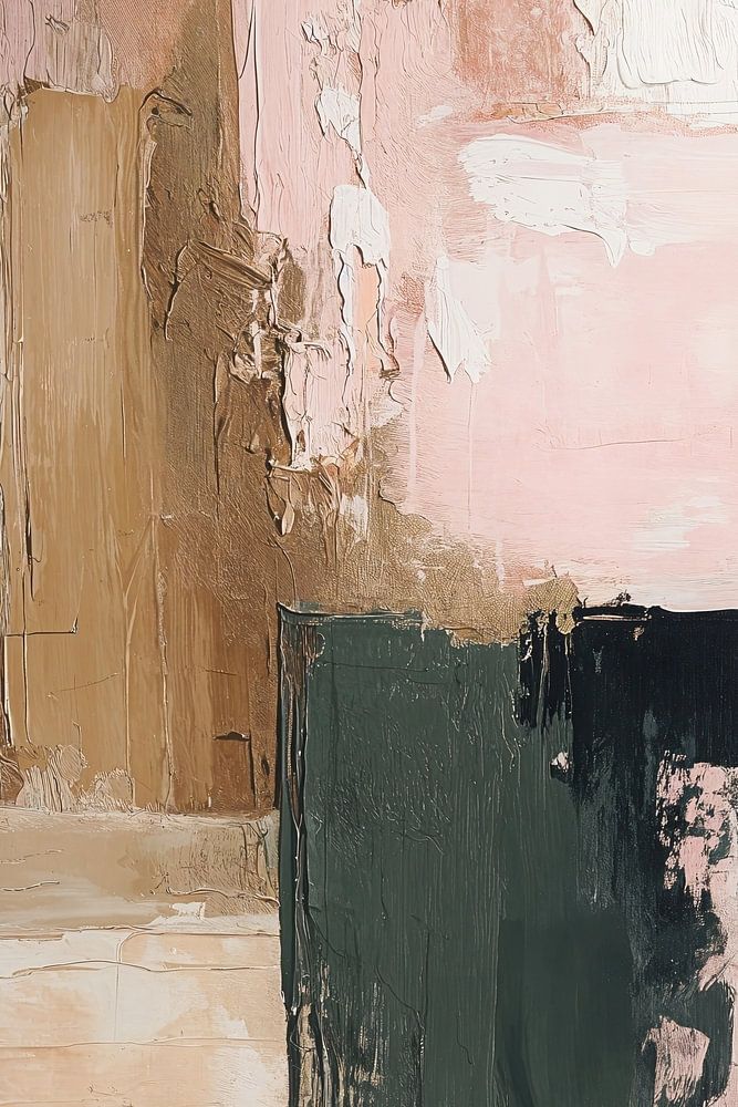 Ein abstraktes Kunstwerk, in dem sanfte Pastelltöne harmonisch ineinanderfließen. Die Kombination aus Puderrosa, Salbeigrün und tiefem Petrol erzeugt eine urbane Romantik. Die strukturierten Pinselstriche und organischen Formen evozieren ein modernes Stadterlebnis, übersetzt in einen verträumten Eindruck, während die rosafarbenen, blütenartigen Akzente für eine natürliche Sanftheit sorgen.