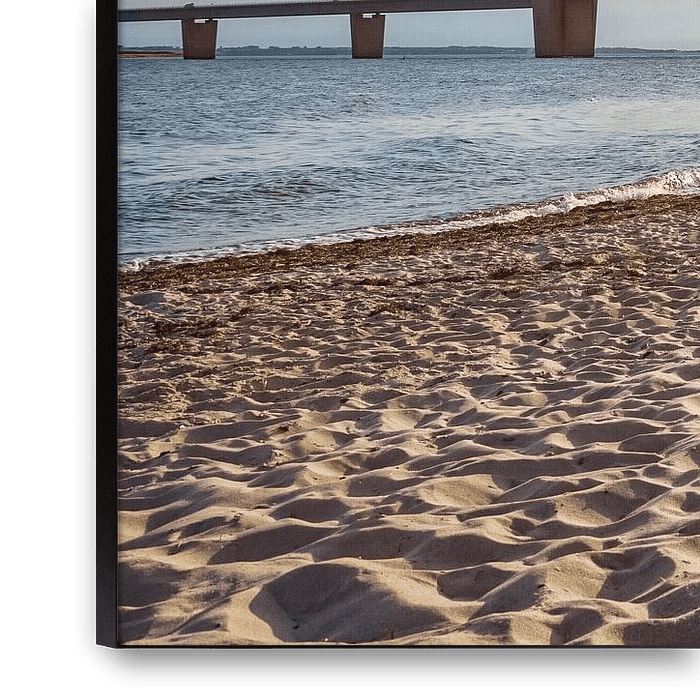 Ein weiter Sandstrand, sanft umrahmt von Gräsern und ruhigem Wasser, öffnet den Blick auf eine elegante Bogenbrücke, die sich wie ein technisches Kunstwerk über das Meer spannt. Die warmen Sonnenstrahlen des frühen Abends tauchen die Szene in goldenes Licht, während zarte Wolken den Himmel durchziehen und eine friedliche Atmosphäre…