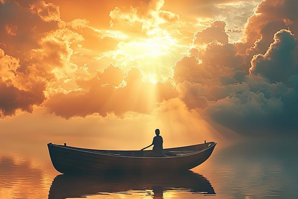Ein Mann segelt allein auf einer ruhigen See, während das Sonnenlicht subtil durch eine drohende dunkle Wolkendecke bricht. Der Himmel und das Wasser spiegeln wunderschöne Schattierungen von tiefem Blau, Grau, Grün und Gold wider und verleihen dem Gemälde eine magische Atmosphäre. Die ruhige Komposition strahlt ein Gefühl von Einsamkeit und Hoffnung aus, ein perfektes Kunstwerk, das Wärme und Geheimnis in jedes Wohnzimmer bringt.