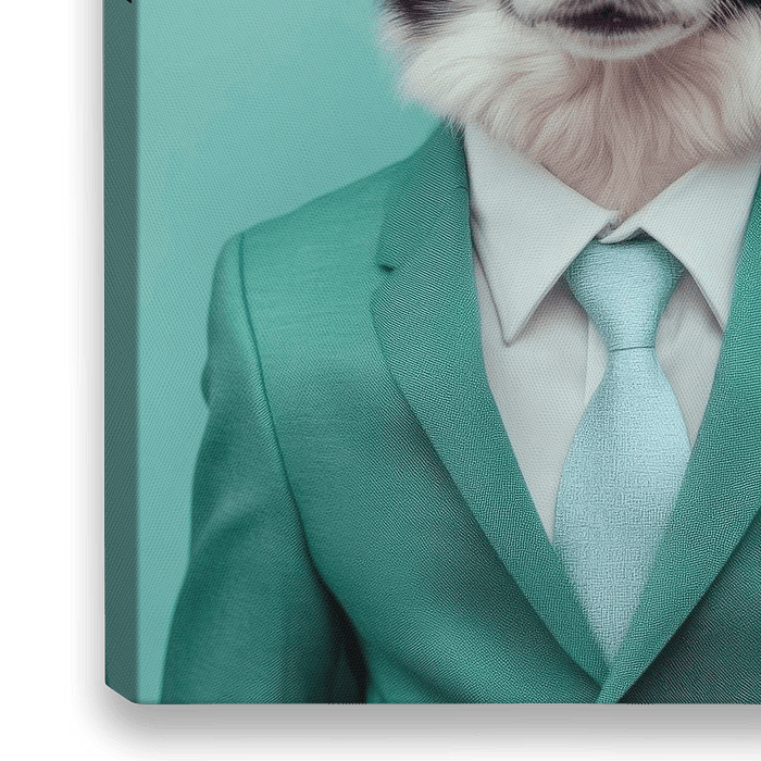 Mit elegantem Charme verkörpert dieser Border Collie in einem mintgrünen Anzug das perfekte Zusammenspiel von Intelligenz und Stilsicherheit. Sein strahlend schwarzes und weißes Fell hebt sich lebhaft vom sanften Hintergrund ab, während die treuen Augen voller Lebensfreude und cleverer Wachsamkeit blicken – bereit, das nächste Abenteuer…