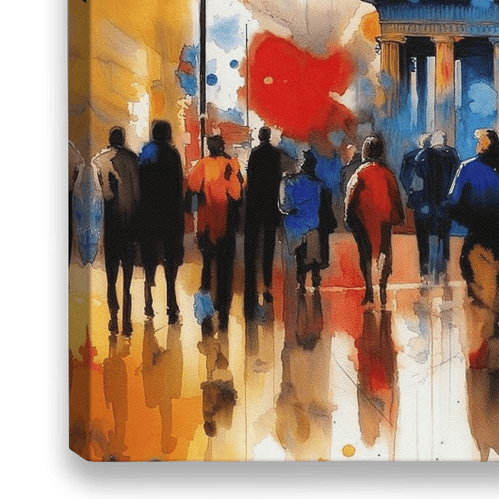 Modernes abstraktes Wandbild vom Brandenburger Tor in Berlin, ein sehr farbenfrohes Kunstwerkt im modernen Pop-Art Stil mit vielen bunten Farbklecksen und aquarellartigen Farbverläufen.