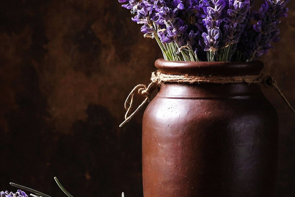Dies ist ein digitales Kunstwerk von 1 großen dunkelbraunen Vase mit Lavendel gefüllt. Die Vase steht auf einem alten Holztisch in einem Raum. Auf dem Tisch liegt ein Strauß Lavendel und ein Holzbrett. Die Szene ist durch das warme Morgenlicht wunderschön beleuchtet. Es ist ein stimmungsvolles und romantisches Bild ganz in dunklen Erdtönen.