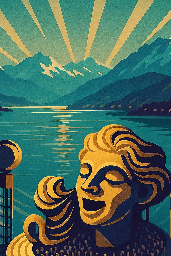 Dieses Bregenz Art Deco Plakat fängt den kulturellen Geist der österreichischen Stadt am Bodensee ein. Das Kunstwerk zeigt die ikonische schwimmende Opernbühne mit ihrem dramatischen skulpturalen Mittelstück vor schimmerndem Wasser und majestätischen Alpengipfeln. Stilisierte Sonnenstrahlen erstrecken sich über den See und betonen die einzigartige Mischung aus natürlicher Schönheit und kultureller Raffinesse, die Bregenz ausmacht. Das im Stil eines alten Reiseplakats gestaltete Werk verwendet kräftige Blautöne, goldene Akzente und klare Art-Déco-Linien, um eine zeitlose Komposition zu schaffen. Dieses Bregenzer Wandbild ist perfekt für Liebhaber von Opern, Architektur und Alpenlandschaften und bietet eine eindrucksvolle visuelle Geschichte von Österreichs kulturellem Juwel. Ob in einem modernen Wohnzimmer, in einem Künstleratelier oder in einer Sammlergalerie, dieser Druck verleiht Eleganz und einen Hauch von Abenteuer. Es ist ein ideales Geschenk für Reisende, Auslandsösterreicher oder Designliebhaber. Bringen Sie die Harmonie von Musik, Bergen und Wasser mit diesem einzigartigen Poster in Ihr Zuhause.