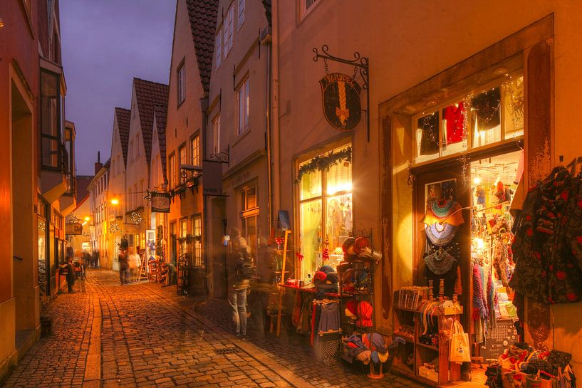Über „Bremer Schnoorviertel mit Weihnachtsbeleuchtung bei Abendämmerung, Bremen, Deutschland“ von Torsten Krüger