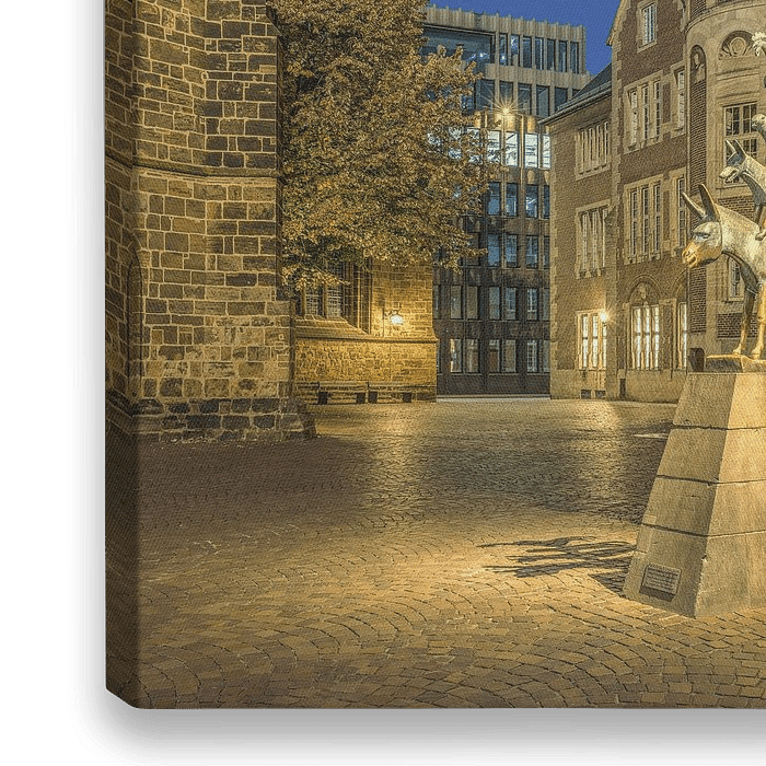 Bestelle das Foto Bremer Stadtmusikanten am Abend von Michael Valjak als Reproduktion auf Leinwand, Alu-Dibond, als Poster, Fototapete oder Acrylglasbild.