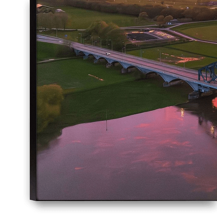 Bestelle dieses Landschafts-Wandbild Brücke in einem farbenprächtigen Sonnenuntergang über dem Fluss IJssel von Sjoerd van der Wal Fotografie als Reproduktion auf Leinwand, Alu-Dibond, als Poster, Fototapete oder Acrylglasbild.