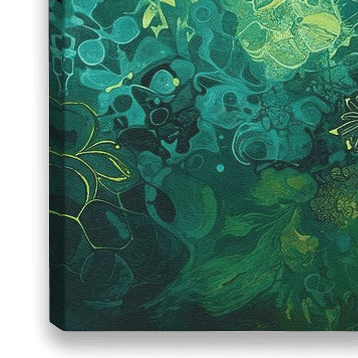 Bubble Dance | Abstrakter Ozean - Diese Leinwand lädt Sie in eine lebendige Unterwasserlandschaft mit einer reichen Palette von Aquamarin- und Smaragdtönen ein, die durch sonnige gelbe Akzente ergänzt werden. Das abstrakte Bild ist mit organischen Formen und Blasenmustern gefüllt, die eine dynamische und dennoch beruhigende Komposition…