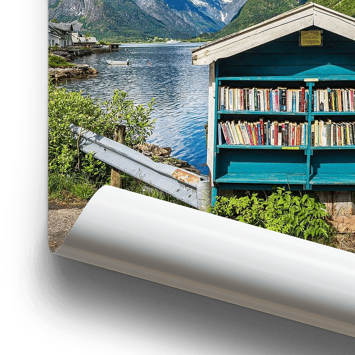 Bestelle dieses Landschafts-Wandbild Bücherauslage in Fjærland in Norwegen von Rico Ködder als Reproduktion auf Leinwand, Alu-Dibond, als Poster, Fototapete oder Acrylglasbild.