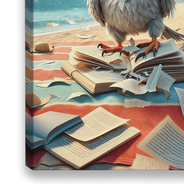 Bestelle dieses Vögel Wandbild Büchertraum am Strand von artefacti als Reproduktion auf Leinwand, Alu-Dibond, als Poster, Fototapete, ArtFrame oder Acrylglasbild, maßgefertigt in höchster Qualität.
