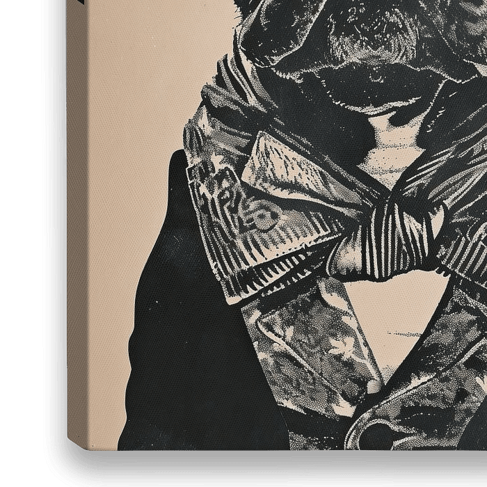 Bulldog - Dieses Porträt zeigt eine charmante Bulldogge mit fast menschlichem Ausdruck, gekleidet in eine lässige Krawatte mit raffinierten Details, die ihr einen Hauch von Klasse verleihen. Der Künstler spielt mit einer begrenzten Farbpalette von Erdtönen und Schwarz, mit einem Pop-Art-ähnlichen Ansatz in der stilisierten Wiedergabe…