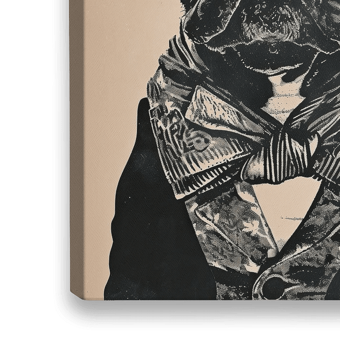 Bulldog - Dieses Porträt zeigt eine charmante Bulldogge mit fast menschlichem Ausdruck, gekleidet in eine lässige Krawatte mit raffinierten Details, die ihr einen Hauch von Klasse verleihen. Der Künstler spielt mit einer begrenzten Farbpalette von Erdtönen und Schwarz, mit einem Pop-Art-ähnlichen Ansatz in der stilisierten Wiedergabe…