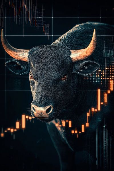 Ein kraftvoller Stier mit beeindruckenden Hörnern sticht vor einem dynamischen Hintergrund aus Finanzdiagrammen hervor, symbolisiert Stärke und Erfolg. Die energetische Komposition bringt einen Hauch von Entschlossenheit in Räume, perfekt geeignet für das Büro oder einen kreativen Arbeitsbereich, wo Entscheidungen und Innovationen…