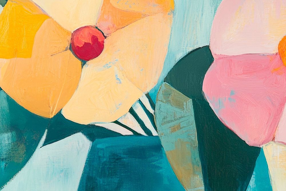 Lebendige Farben verschmelzen zu einem harmonischen Spiel aus Formen, während sanfte Blüten in einem stilvollen Vasenarrangement erblühen. Die Kombination aus zarten Pastelltönen und kräftigem Blau strahlt Frische und Lebensfreude aus, ideal für das Wohnzimmer oder die Küche, um eine einladende Atmosphäre zu schaffen, die den Alltag aufblühen lässt.