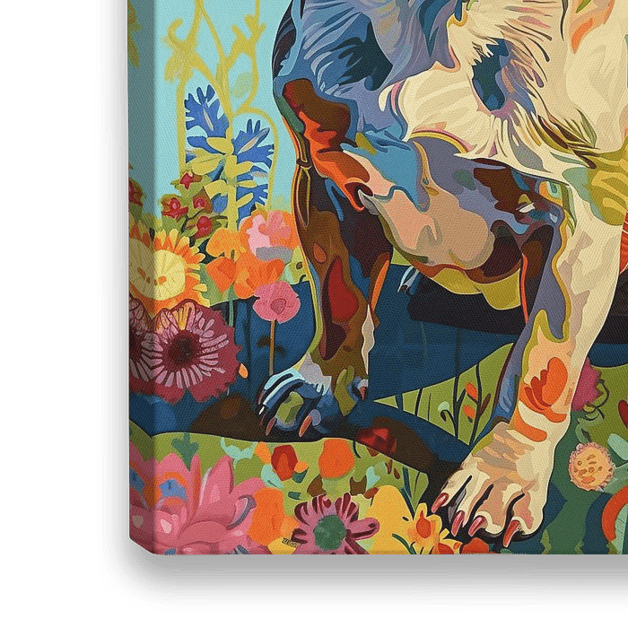 Colourful Bulldog | Bulldog Artwork - Mit einer lebhaften Farbmischung bringt dieses Porträt einer Bulldogge eine verspielte Energie in den Raum. Die ausdrucksstarken Pinselstriche und Farbkontraste sind absolut zeitgemäß, während der florale Hintergrund einen romantischen Touch verleiht. Das Gemälde strahlt einen frischen, eklektischen…