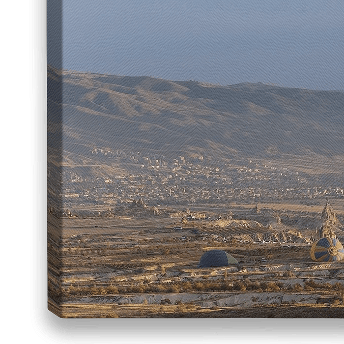 Das Bild zeigt die atemberaubende Landschaft Kappadokiens, die bekannt ist für ihre bizarren Tuffsteinformationen und farbenprächtigen Felder. In der Morgendämmerung erheben sich elegant bunte Heißluftballons in den strahlend blauen Himmel, während die warmen Farben der aufgehenden Sonne die Szenerie in ein magisches Licht tauchen. Die…