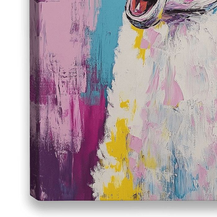 Buntes Gespräch - Dieses Tierbild zeigt ein lebhaftes und ausdrucksstarkes Lama mit offenem Maul, das durch kräftige Pinselstriche in Rosa, Blau und Weiß dynamisch und verspielt wirkt.