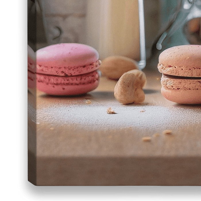 Bunte Macarons mit Backzutaten im weichen Licht vor einem Fenster mit einer Landschaft im Hintergrund