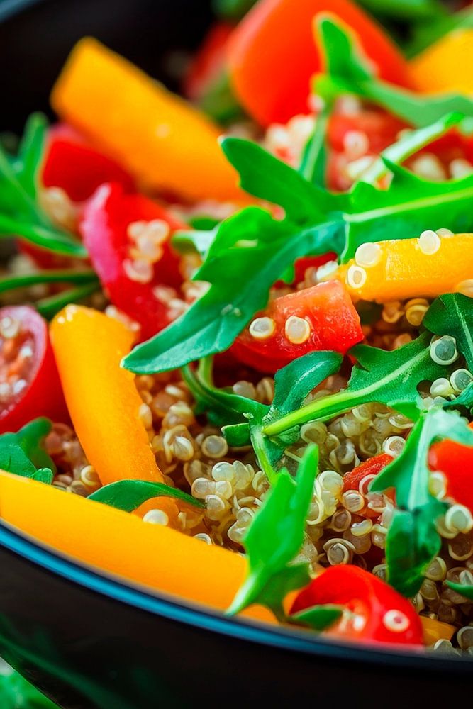 Ein farbenfrohes Zusammenspiel aus frischen Gemüsesorten und knackigem Rucola entfaltet sich in einer eleganten Schüssel. Die leuchtenden Farben der Tomaten und Paprika verleihen der Szene eine lebendige Energie. Perfekt geeignet für die Küche, bringt dieses Bild eine gesunde und einladende Atmosphäre, die zum Kochen und Genießen anregt.