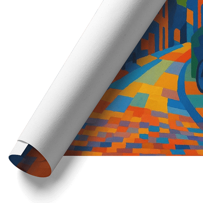 Erkunden Sie eine lebendige, geometrische Straße voller Farben, in der sich ein ikonischer Turm über charmante Häuser erhebt und die Energie der Stadt zu spüren ist.