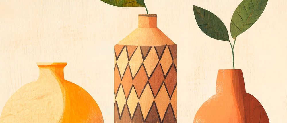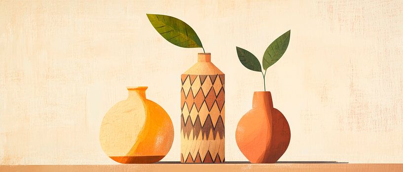 Mit sanften Erdtönen und organischen Formen strahlt diese Komposition von Vasen Ruhe und Harmonie aus. Die geschwungenen Linien und die stilisierten Blätter verleihen dem Raum eine frische Note. Ideal für eine Küche oder ein Wohnzimmer, wo sie eine einladende, natürliche Atmosphäre schaffen und den Raum lebendig wirken lassen.