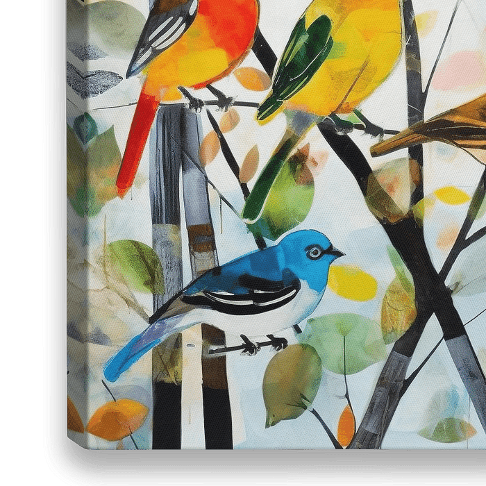 Bestelle dieses Vögel Wandbild Bunte Vögel in einem Baum Illustration von ARTemberaubend als Reproduktion auf Leinwand, Alu-Dibond, als Poster, Fototapete, ArtFrame oder Acrylglasbild, maßgefertigt in höchster Qualität.