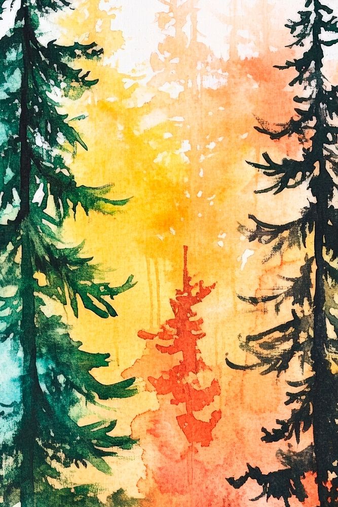 In einem harmonischen Spiel aus satte Töne verwöhnt eine majestätische Waldlandschaft das Auge. Die tiefen, eleganten Tannen verkörpern Stärke, während leuchtende orange und grüne Akzente ein Gefühl von Energie und Ruhe vermitteln. Ideal in einem Wohnzimmer, schafft dieses Kunstwerk eine einladende, entspannende Atmosphäre, die zum Verweilen einlädt.