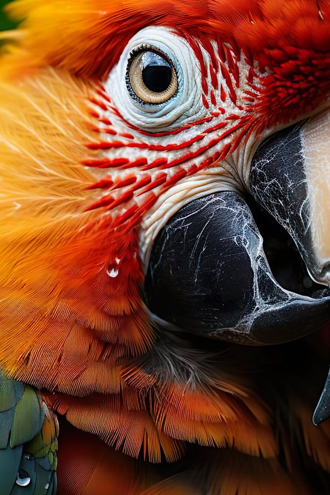 Der Kopf eines farbenfrohen Papageis ist ein auffälliger und lebendiger Anblick. Er wird von leuchtenden Farben dominiert, mit einem kräftigen Schnabel, der oft mit dem Gefieder kontrastiert. Die Augen strahlen Intelligenz aus und zeigen Lebendigkeit. Das Gefieder variiert in Rot-, Blau-, Gelb- und Grüntönen, was eine schöne Farbpalette ergibt. Er ist ein Symbol für exotische Schönheit und Verspieltheit.