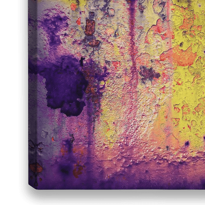 Eine digitale Überlagerung von Fotos rostiger Oberflächen: Lila-, Gelb- und Rottöne und Rost bilden eine chaotische, aber faszinierende Mischung. Rostschlieren, Rostfecken und rissige Farbe erzeugen Dynamik auf der strukturierten Oberfläche.