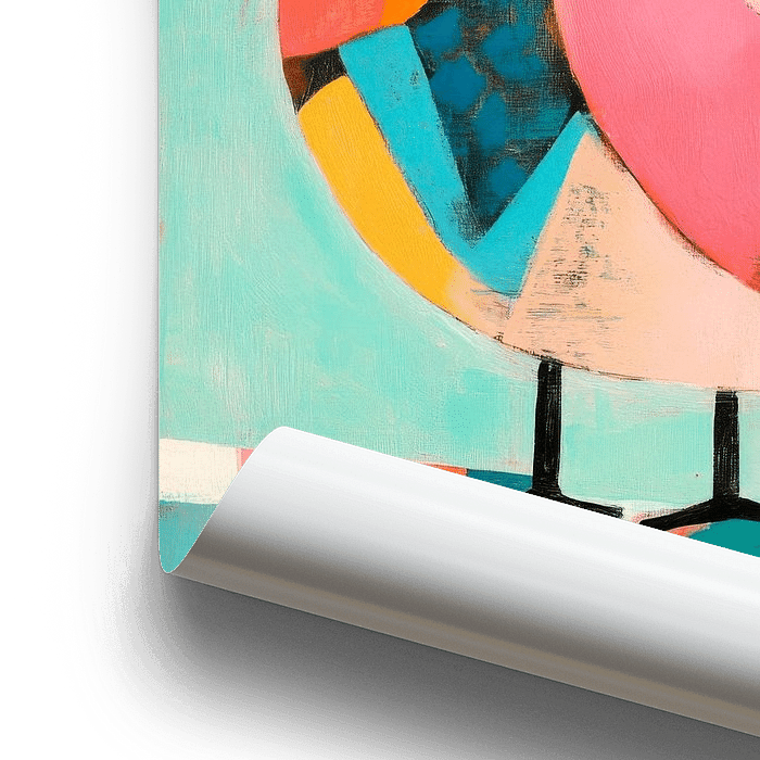 Ein lebhaftes Wesen mit bunten, geometrischen Formen strahlt Lebensfreude aus. Die klaren Farben von Rosa, Blau und Gelb umarmen die Konturen, während die große schwarze Schnabelspitze neugierig ins Nichts blickt. Auf der sanften Hintergrundfläche schimmert ein Hauch von Grün, der die verspielte Atmosphäre perfekt ergänzt. Ein witziger…