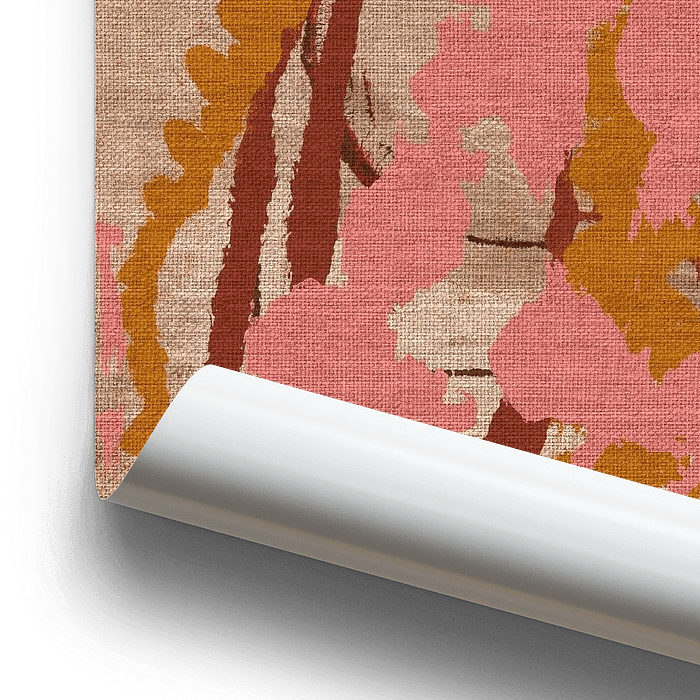 Bestelle dieses abstrakte Wandbild Bunter Wandteppich. Rosa Blumen und ockerfarbene Farnblätter. von Dina Dankers als Reproduktion auf Leinwand, Alu-Dibond, als Poster, Fototapete oder Acrylglasbild.