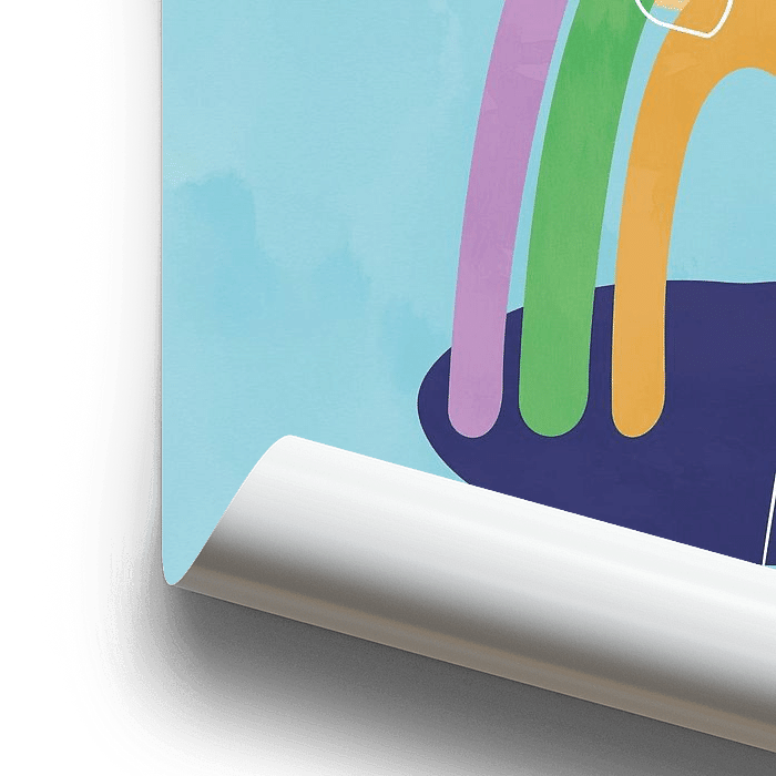 Abstrakte Illustration eines Regenbogens, mit einer Blume im Vordergrund und der Sonne im Hintergrund. Zusammen mit einer Form, bei der es sich um einen kleinen See handeln könnte, bilden diese Elemente eine minimalistisch-abstrakte Landschaft in fröhlichen Farben.