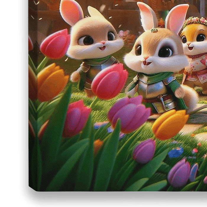 Das Bild strahlt die ganze Freude eines Frühlingsfestes aus, in dem kleine Tierkinder in mittelalterlichen Kostümen die Hauptrolle spielen. Die Szenerie ist ein lebhaftes Straßenbild, wohl in einem Dorf, geschmückt mit farbenfrohen Wimpeln und blühenden Blumen. Im Vordergrund sehen wir eine Gruppe von Hasen und Füchsen, die festliche…