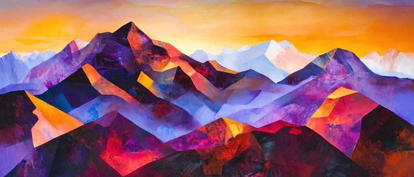 Funkelnde Sonnenstrahlen tauchen majestätische, farbenfrohe Berge in warme Goldtöne, während tiefere Violett- und Rotnuancen faszinierende Schatten werfen. Dieses lebendige Kunstwerk sorgt für ein inspirierendes Ambiente und verwandelt jedes Wohnzimmer in eine Oase der Ruhe und Kreativität, die zum Träumen einlädt.