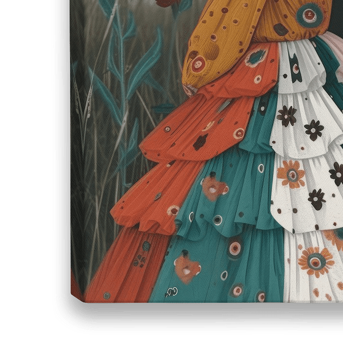 Buntes Porträt mit Blumen. Eine digitale Illustration einer jungen Frau in superbunter Kleidung, die durch ein Feld läuft.