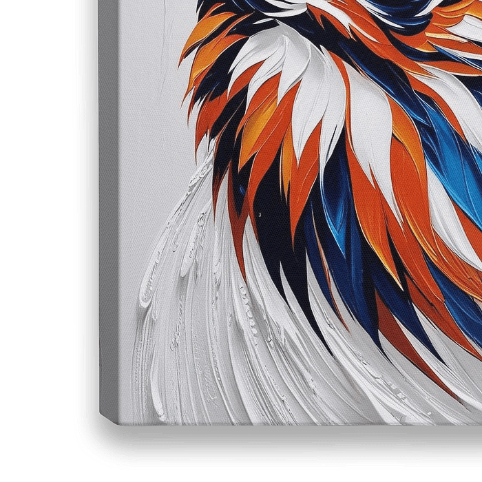Dieses auffällige Kunstwerk zeigt eine dynamische und farbenfrohe Eule, wobei die Mischung aus blauen, orangen und weißen Farbtönen sofort ins Auge fällt. Die Textur der Federn sorgt für ein lebendiges Aussehen, als ob das Tier zum Leben erwachen würde. Die Verwendung von abstrakten Linien und Formen in Kombination mit einem surrealen…