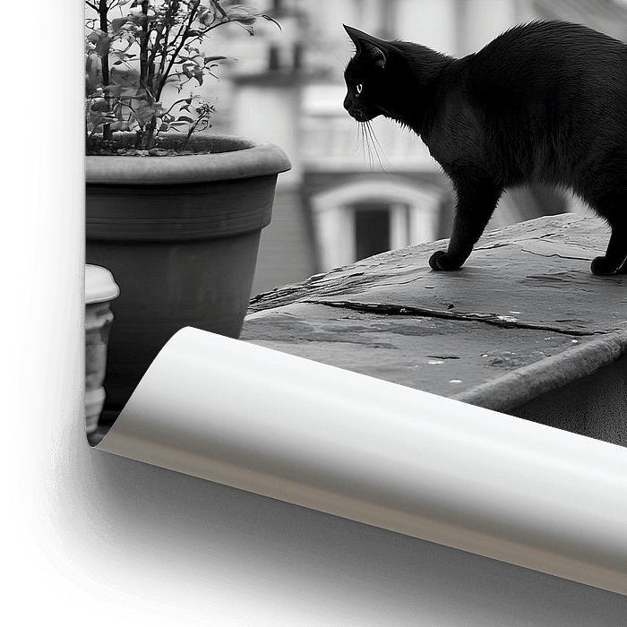 Diese stimmungsvolle Schwarzweißfotografie zeigt eine schwarze Katze, die elegant auf einem Pariser Dach steht. Ihre Silhouette hebt sich geheimnisvoll gegen den hellen Himmel ab, während im Hintergrund verschwommen der Eiffelturm und Dächer und Schornsteine der Stadt zu erkennen sind.