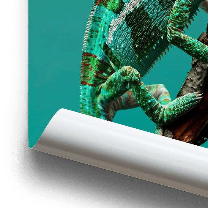Dieses fesselnde Chamäleon-Porträt präsentiert eine beeindruckende Verschmelzung von Natur und Kunst. Die detailreiche, mosaikartige Schuppenstruktur des Chamäleons spiegelt die Vielfalt geometrischer Formen wider und erinnert an abstrakte Kunst. Die Farbenpracht, die von intensiven Türkis- und Grüntönen bis hin zu feinen Akzenten von…