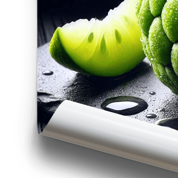 Dieses digitale Poster fängt einen seltenen, beinahe sinnlichen Moment der Natur ein: die exotische Schönheit der Cherimoya in ihrer ganzen frischen, tropisch-grünen Pracht. Die Szene zeigt eine Nahaufnahme dieser außergewöhnlichen Frucht, angerichtet auf einer dunklen Schieferplatte,…